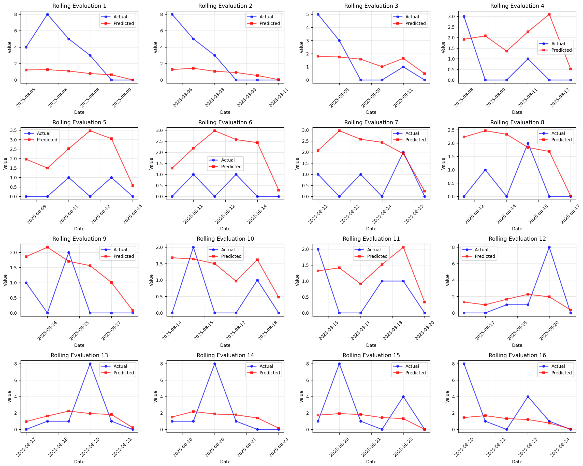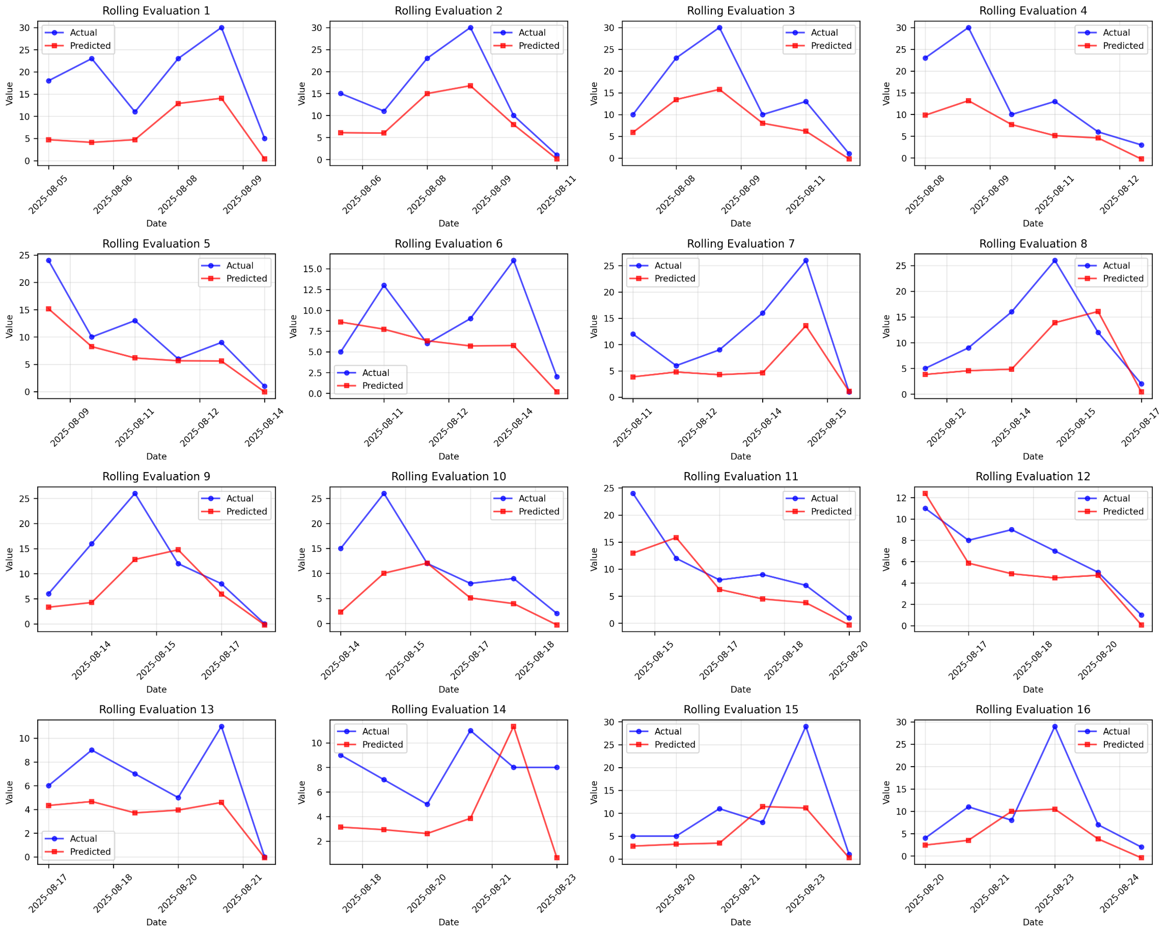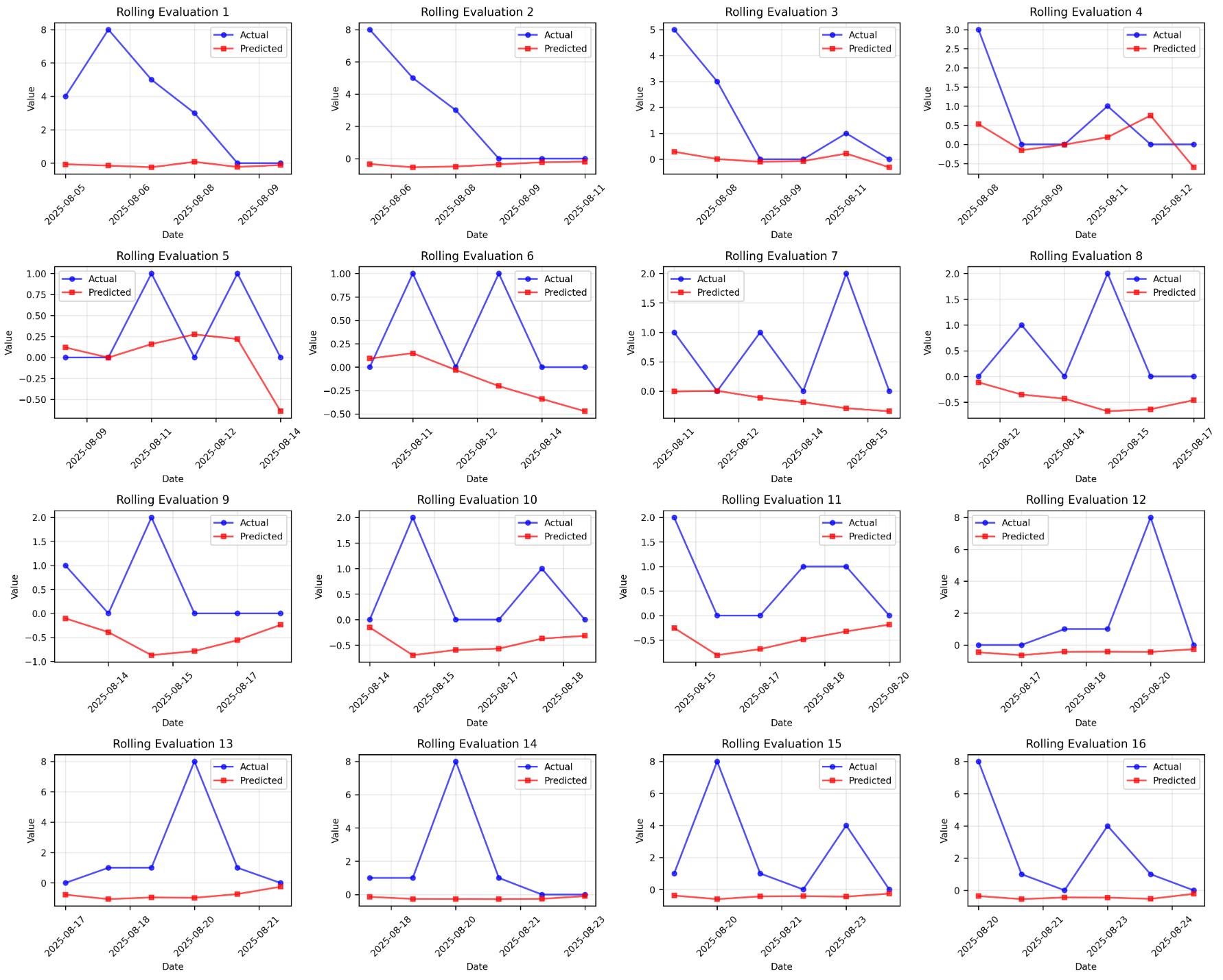- Prophet showed robustness to noise. Branch 3 had severe noise before the evaluation time so that both TimesFM and the Daily prediction of Prophet produced poor results. Besides, hourly prediction of Prophet is quite robust.