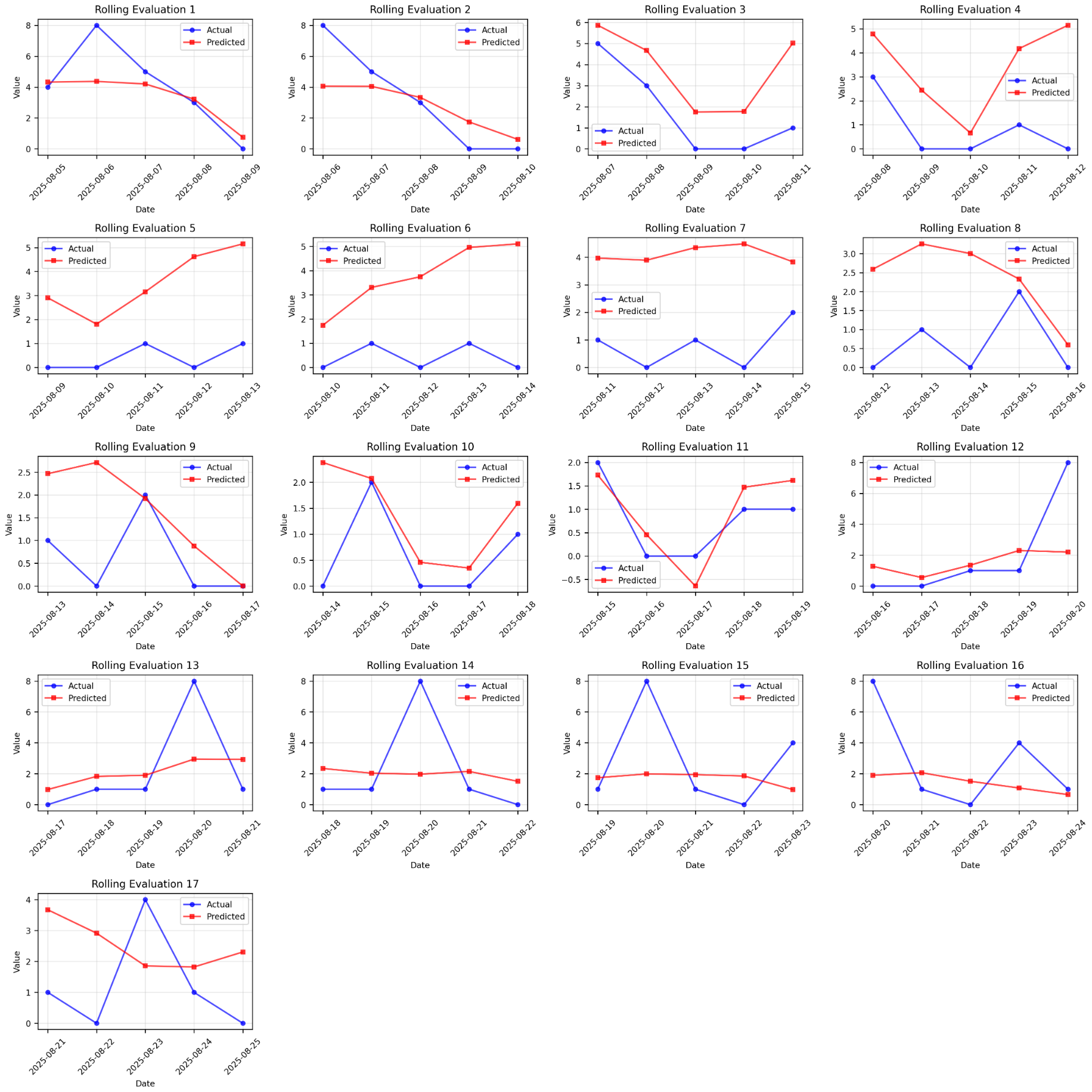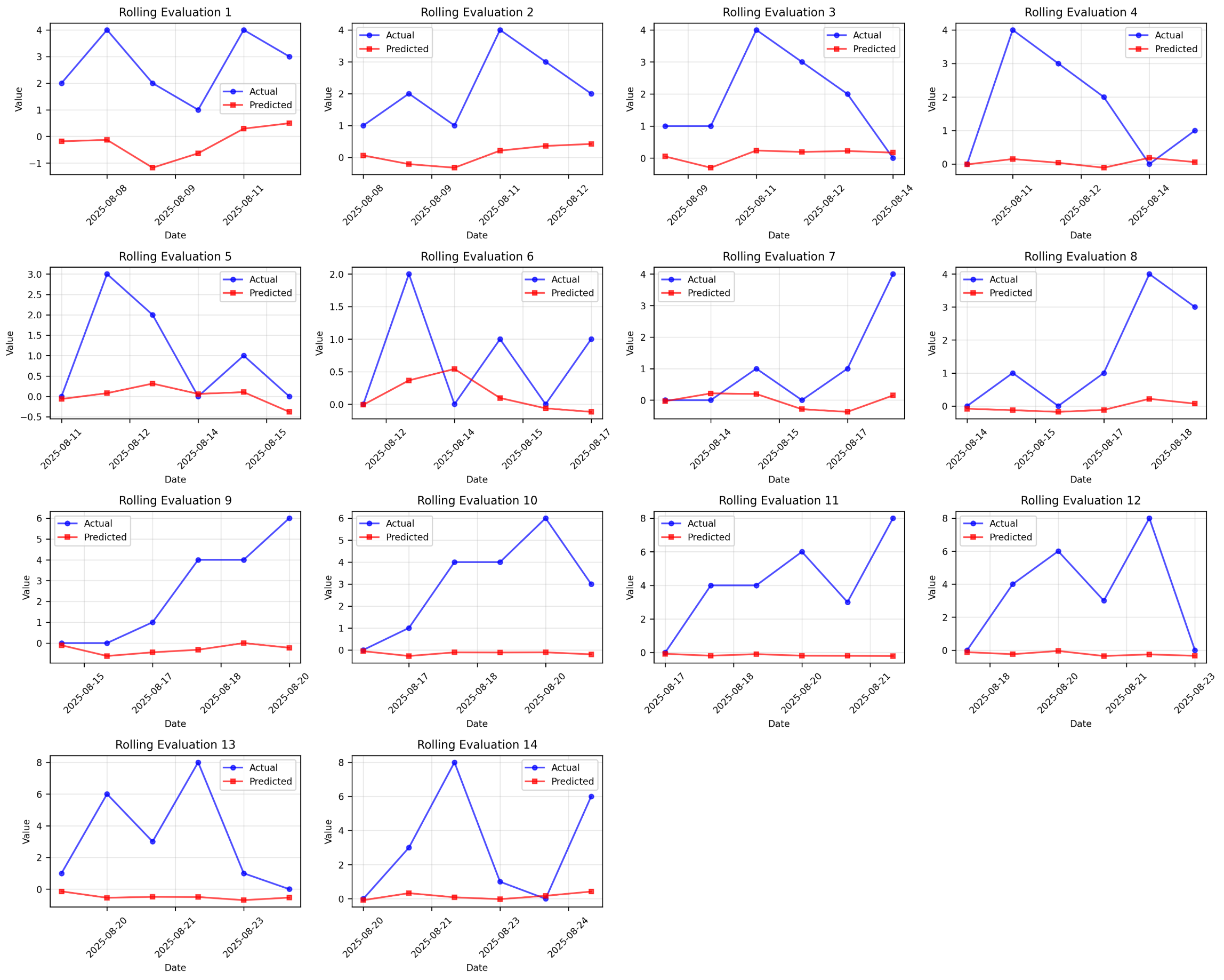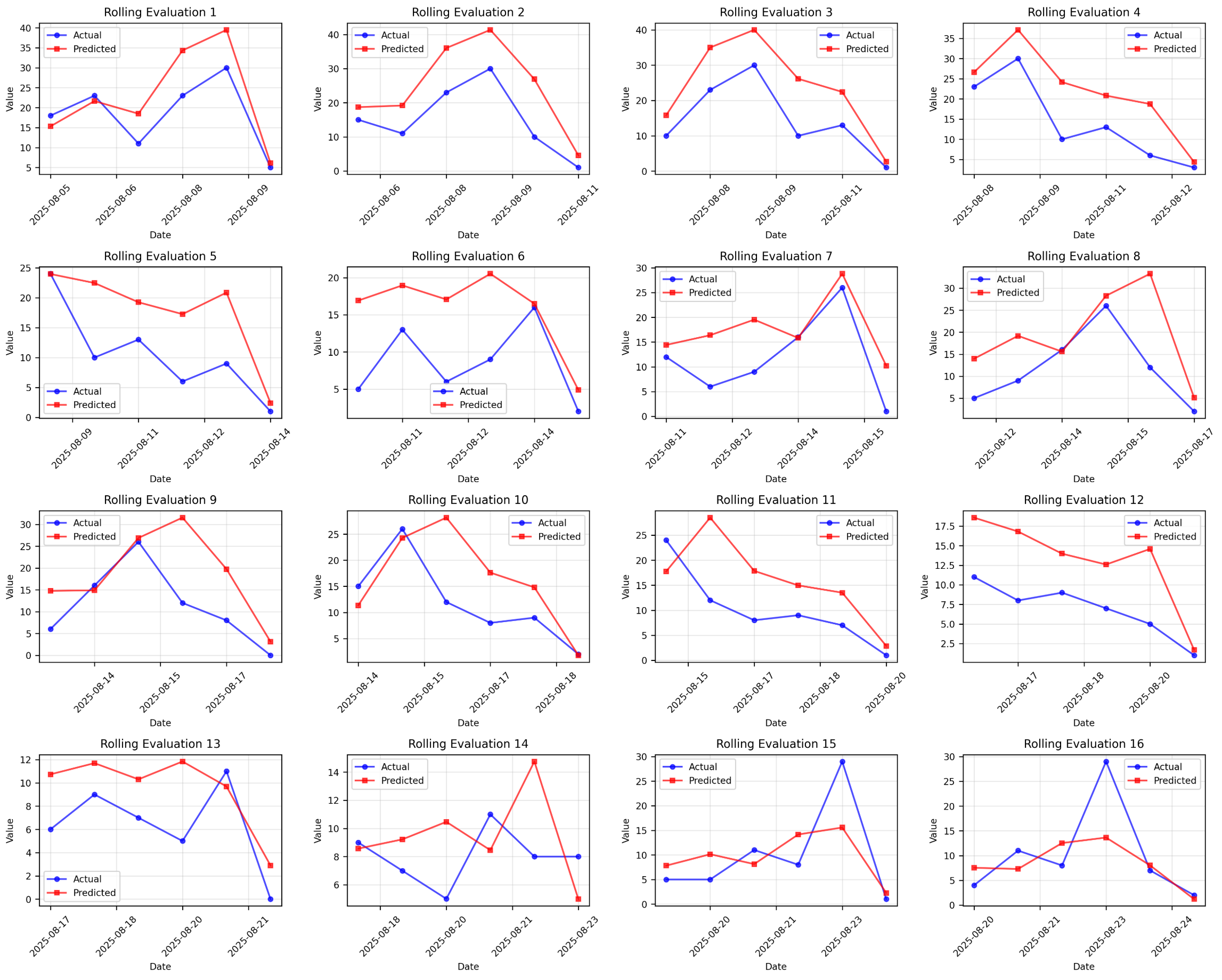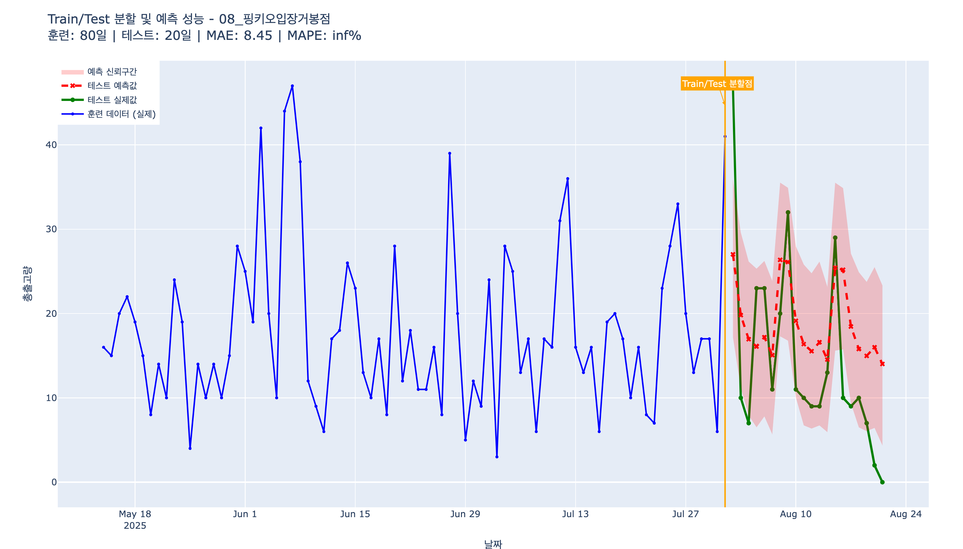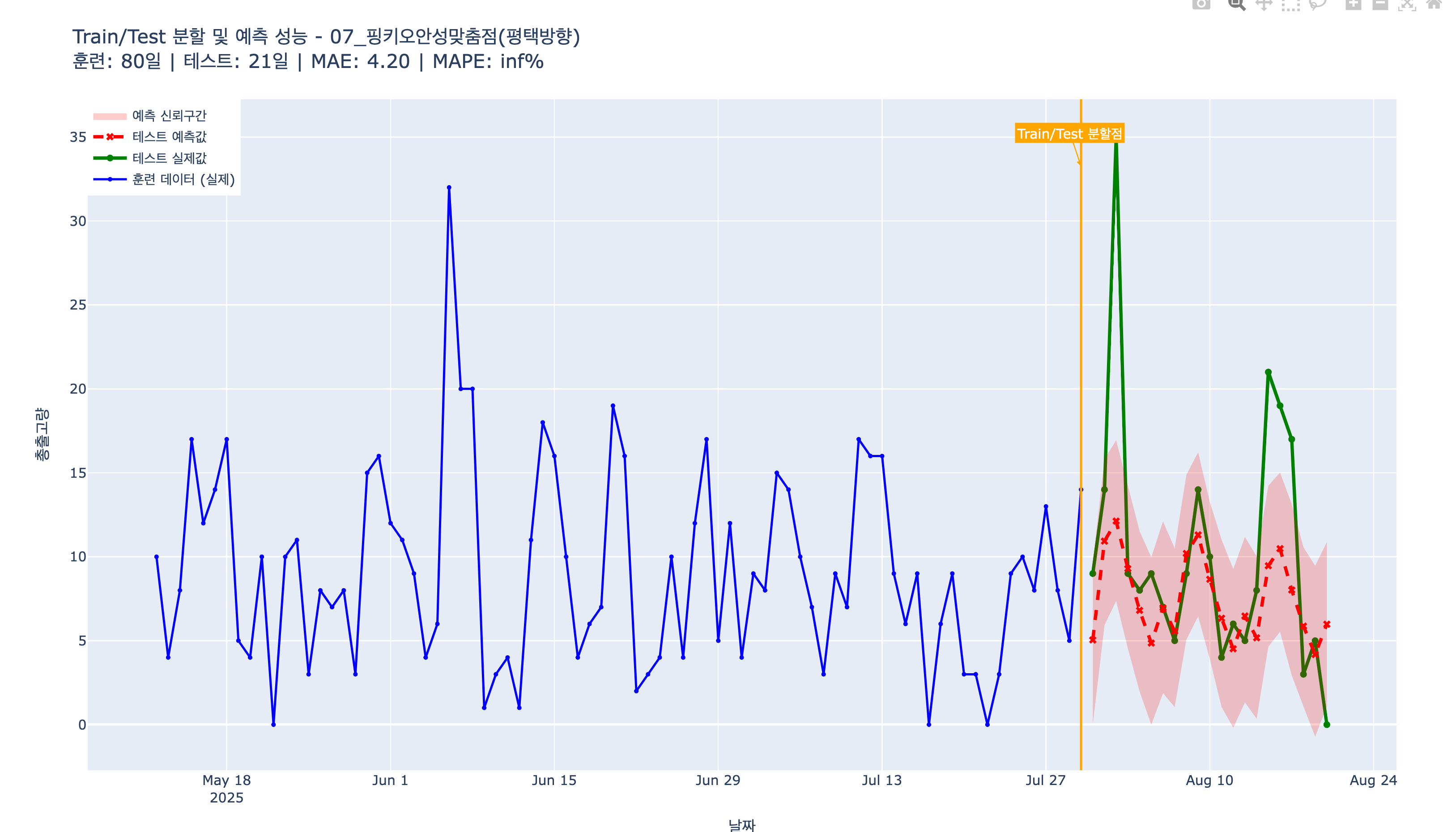 Prophet showed an error persentage of less than 20%. I thought it was sufficient. Next, I compared it with TimesFM for 3 branches. Simultaneously, I compared hourly and daily predictions.